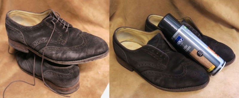 W prezentowanej parze dokonaliśmy kompleksowego czyszczenia cholewek oraz rekoloryzowaliśmy cholewki butów przy pomocy sprawdzonego środka jakim jest renowator koloru do zamszu firmy Woly.